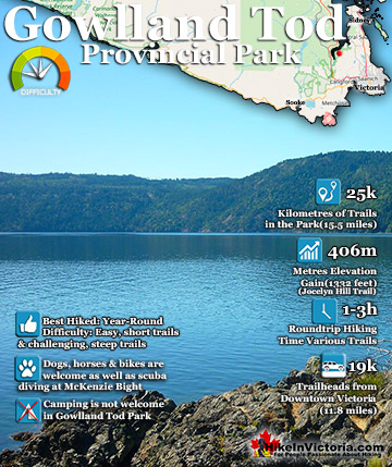 Victoria Hiking Trails RatingGowlland Tod Provincial Park is a beautiful park running along the Saanich Inlet just a short drive from downtown Victoria.  Accessible from Goldstream Park at one end and Brentwood Bay, near Butchart Gardens at the other.  From beautiful ocean views of the inlet to wonderful mountain views from Mount Work, this park has a great variety of characteristically Victoria hiking.